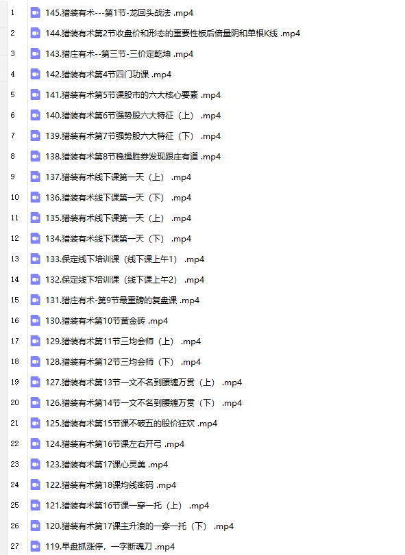 001.猎装有术--第65课《换手榜选股+复盘强势股》 .mp4 436.64M 002.猎装有术--第64课《振幅榜选股大于7%》 .mp4 435.38M 003.猎装有术--第63课《振幅榜选股小于4%》 .mp4 367.44M 004.猎装有术--第62课《跌幅榜选股之否极泰来和左右开弓》 .mp4 409.37M 005.猎装有术--第61节课《涨幅榜选股》 .mp4 331.45M 006.猎装有术--第60节《静态选股之龙虎榜》 .mp4 396.39M 007.猎装有术-第59课《二板一字涨停板》 .mp4 381.49M 008.猎装有术-第59节课,《T字不破再涨停》 .mp4 388.28M 009.猎装有术-第58节课《龙回头后再涨停》 .mp4 413.87M 010.猎装有术-第57节课《三足鼎立准涨停》 .mp4 415.72M 011.猎装有术-第56课《星光闪耀捧涨停》 .mp4 407.81M 012.猎装有术-第55节《强于大盘出涨停.》 .mp4 372.91M 013.猎装有术第54节《步步高升见涨停.》 .mp4 344.17M 014.猎装有术-第53节课《脱轨而出奔涨停.》 .mp4 406.10M 015.猎装有术-第52节课《相对锁仓加绝对锁仓》 .mp4 361.75M 016.猎装有术-第51课《自救型涨停板》 .mp4 428.81M 017.猎装有术-第50课《出货型涨停板》. .mp4 402.96M 018.猎装有术第49节课《洗盘型涨停板.》 .mp4 415.55M 019.猎装有术第48课《拉升型涨停板.》 .mp4 372.74M 020.猎装有术-第47节课《对倒型涨停板.》. .mp4 441.40M 021.猎装有术-第46节课《建仓型涨停板.》 .mp4 403.13M 022.猎庄有术--第45节课《涨停板加复盘强势股》 .mp4 418.21M 023.猎装有术-第44课《我们为什么做涨停板..》 .mp4 419.67M 024.猎装有术-第43课《成交量综合应用.》 .mp4 380.82M 025.猎装有术-第42课《成交量之台阶量.》 .mp4 371.03M 026.猎装有术-第41课《成交量之头肩量.》. .mp4 371.63M 027.猎装有术-第40课《成交量之并肩量.》. .mp4 386.24M 028.猎装有术-第39课<黄昏之星形态和复盘总结.> .mp4 402.58M 029.猎装有术-第38节《股市高压线哥俩剃平头股票不能留》(中).mp .mp4 412.90M 030.猎装有术-第37节课《股市高压线(上)》. .mp4 359.99M 031.猎装有术--第36节课《双剑合璧.战法》 .mp4 393.85M 032.猎装有术--第35节课《天衣无缝(下)》 .mp4 408.57M 033.猎装有术-第34节《天衣无缝(上).战法》 .mp4 349.40M 034.装有术--第33节《-护城河-战法》 .mp4 438.71M 035.猎装有术--第32《课龙凤呈祥(二).》 .mp4 398.91M 036.猎装有术--第31节《龙凤呈祥.战法》 .mp4 333.96M 037.猎装有术-第30节课《龙抬头.战法》 .mp4 392.97M 038.猎装有术-第29节《课金凤还巢之暗度陈仓.》 .mp4 399.12M 039.猎庄有术-第28节《举火烧天战法》 .mp4 378.87M 040.猎庄有术-第27节-《清一色战法》+《强势复盘》 .mp4 402.77M 041.猎庄有术-第26节《突出重围战法》+《强势复盘》 .mp4 414.71M 042.猎庄有术--第25节《金山谷战法》 .mp4 374.87M 043.猎庄有术--第24节《银山谷战法》 .mp4 426.43M 044.猎庄有术--第23节《双零抄底逃顶密码AB:00》 .mp4 416.31M 045.猎庄有术第22节《-双零抄底逃顶密码-AA.BB》 .mp4 411.01M 046.猎庄有术-第21节《双零逃顶密码AB.BA》战法 .mp4 455.85M 047.猎庄有术-第20节《一穿一拖战法》 .mp4 426.84M 048.猎庄有术第19节-《三重保险之均线密码》 .mp4 348.71M 049.猎庄有术-第18节《三重保险之左右开弓》 .mp4 451.33M 050.猎庄有术-第17节《三重保险之心里美》 .mp4 369.50M 051.猎庄有术-第16节-《不破五的股价狂欢》 .mp4 368.00M 052.猎庄有术-第15节《一文不明到腰缠万贯》(下) .mp4 363.62M 053.猎庄有术--第14节《一文不名到腰缠万贯》(上) .mp4 424.92M 054.猎庄有术--第13节《综合能力提升和复盘. .mp4 406.86M 055.猎庄有术--第12节-《三军会师》 .mp4 405.76M 056.猎庄有术-第11节-黄金砖后的印钞行情 .mp4 382.18M 057.猎庄有术-第10节稳操胜券适合所有人 .mp4 443.97M 058.猎庄有术--第9节-均线100分的由来和设置 .mp4 481.63M 059.猎庄有术--第8节如何选出板块最优解和元旦后选股模式 .mp4 464.25M 060.猎庄有术-第7节-跟庄有道之股东研究 .mp4 428.75M 061.猎庄有术---第6节-强势股的六大特征(下) .mp4 412.66M 062.猎庄有术--第5节-强势股的六大特征(上) .mp4 378.10M 063.猎庄有术-第4节合格股民的炒股步骤 .mp4 374.74M 064.猎庄有术--第3节-直播答疑-静态选股和动态选股 .mp4 285.99M 065.猎庄有术-第2节-信仰的力量和张帆老师学习方法 .mp4 353.83M 066.猎庄有术--新一轮第1节-课程大纲-《股市的二-四-六-八-》 .mp4 250.00M 067.猎庄有术--第66节振幅榜选股2 .mp4 282.98M 068.猎庄有术-第65节六大选股原则 .mp4 238.77M 069.猎庄有术-第64节交易系统之性格决定股市收益 .mp4 254.53M 070.猎庄有术-第63节交易系统之交易周期 .mp4 205.76M 071.猎庄有术-第62节-换手榜选股法 .mp4 275.95M 072.猎庄有术-第61节振幅榜选股(下) .mp4 268.49M 073.猎庄有术--第60节振幅榜选股 .mp4 258.93M 074.猎庄有术-第59节跌幅榜选股法 .mp4 242.41M 075.猎庄有术-第58节涨幅榜选股 .mp4 242.41M 076.猎庄有术-第57节直播答疑课 .mp4 237.59M 077.猎庄有术-第56节龙虎榜选股 .mp4 260.67M 078.猎庄有术第55节-脚踩头往上走 .mp4 248.63M 079.猎庄有术第54集--换手板选股 .mp4 252.32M 080.猎庄有术第53集--深眸远虑打首版 .mp4 245.96M 081.猎庄有术第52节--步步登高见涨停 .mp4 247.87M 082.猎庄有术第51节--脱轨而出奔涨停 .mp4 254.30M 083.猎庄有术第50节--相对锁仓型涨停板(直播2022.11.05) .mp4 614.41M 084.猎庄有术第49--拉升型涨停板 .mp4 240.24M 085.猎庄有术第48节--对倒型涨停板 .mp4 368.20M 086.猎庄有术第47节--洗盘型涨停板 .mp4 422.66M 087.猎庄有术第46节--自救型涨停板 .mp4 407.36M 088.猎庄有术-第45-节建仓型涨停板 .mp4 417.58M 089.猎庄有术第44节--